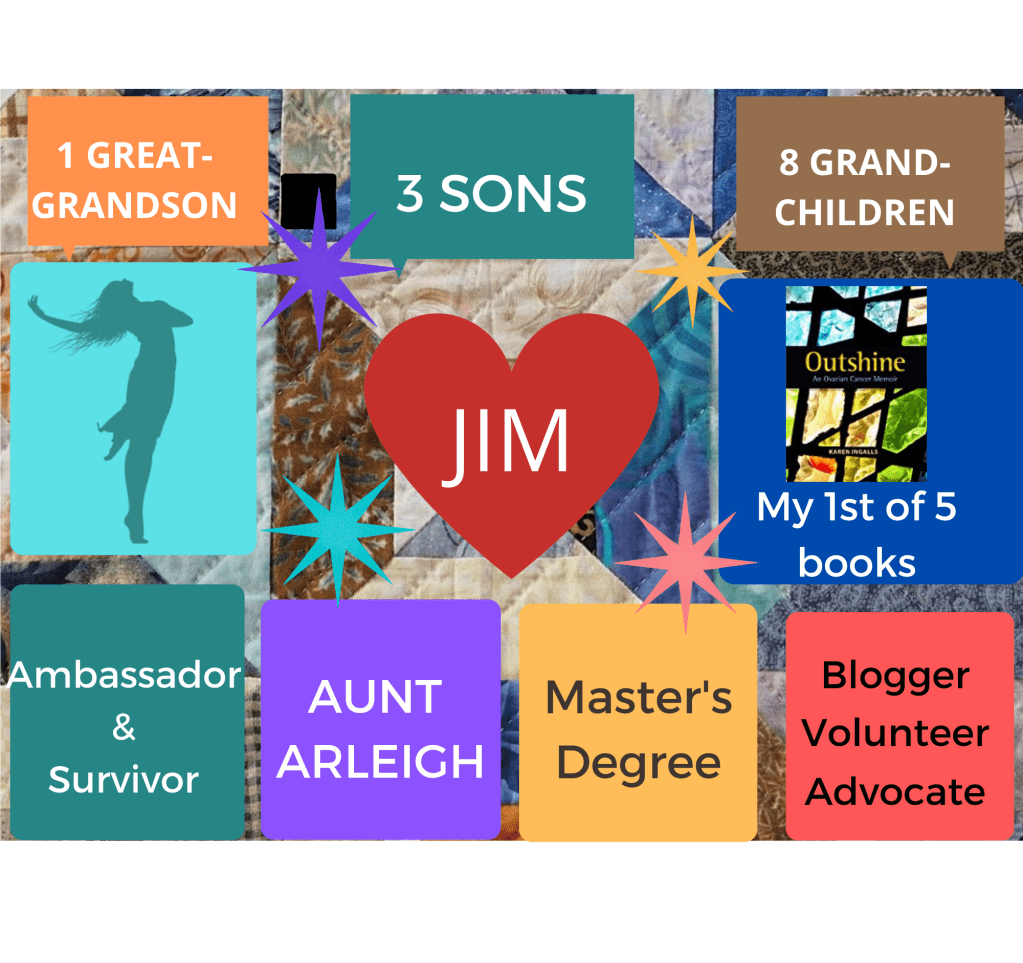 My life quilt’s background is of many colors. My patches include a central patch with a heart representing my wonderful husband. I have a square of just black, which represents the child abuse. It is small now though it was quite large earlier in life. There are squares for my 3 sons, 8 grandchildren, and 1 for my great grandson. I danced (not always smoothly or easily) through the storm of cancer. Earning my master’s degree was an important goal that impacted my career. Aunt Arleigh has always been an inspiration and there for me. The four stars represent steps in my growing faith and spiritual path from childhood to now.
